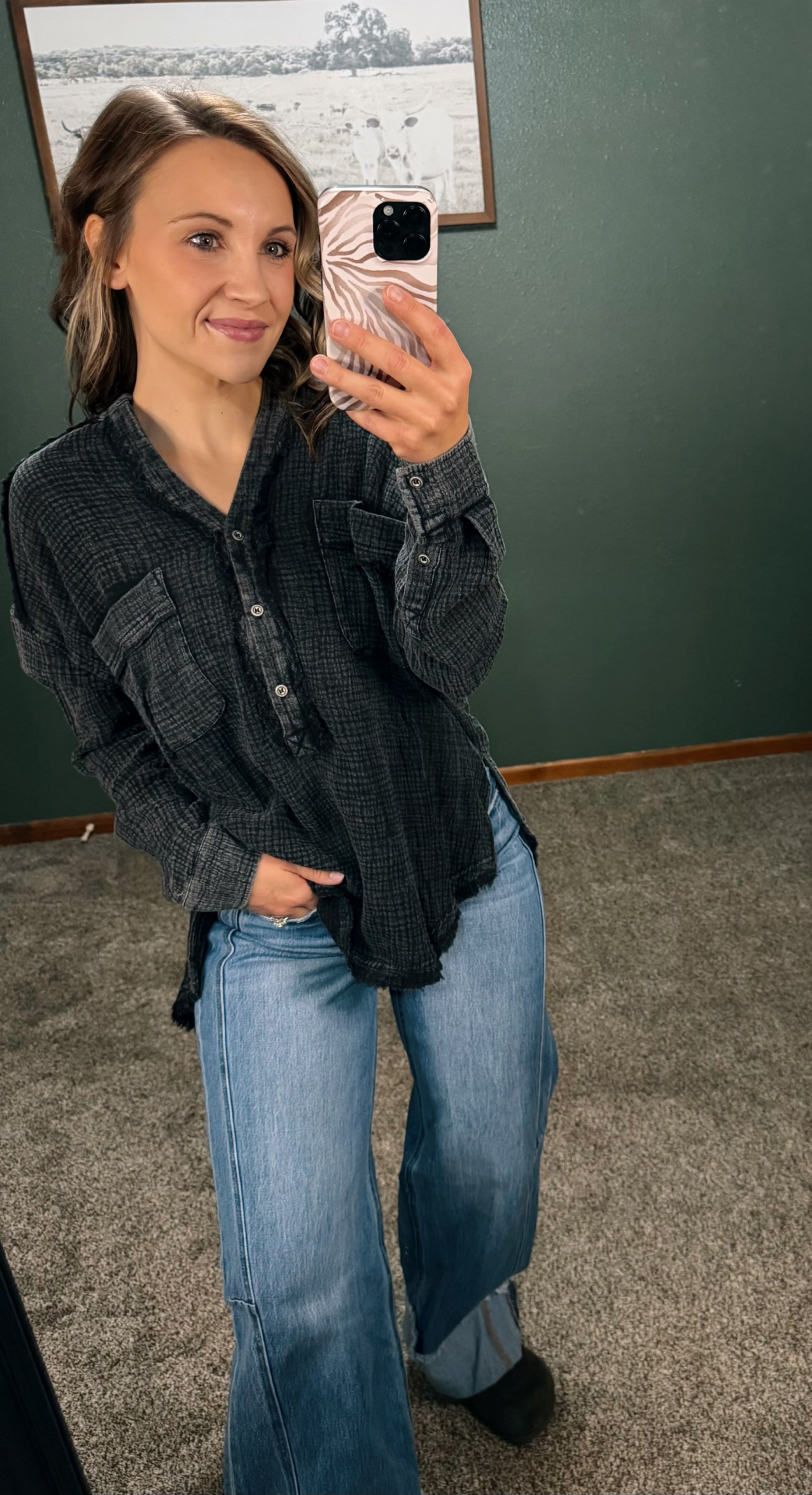 - Long sleeve mineral washed cotton gauze blouse