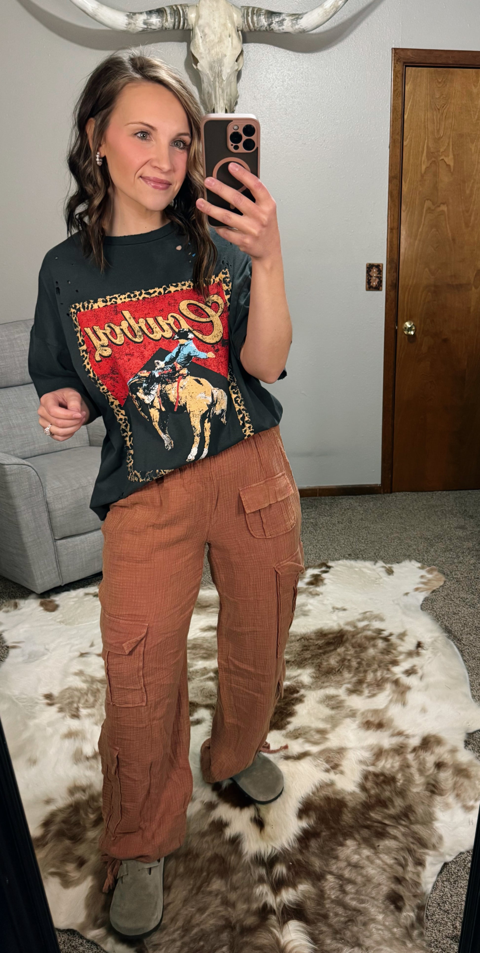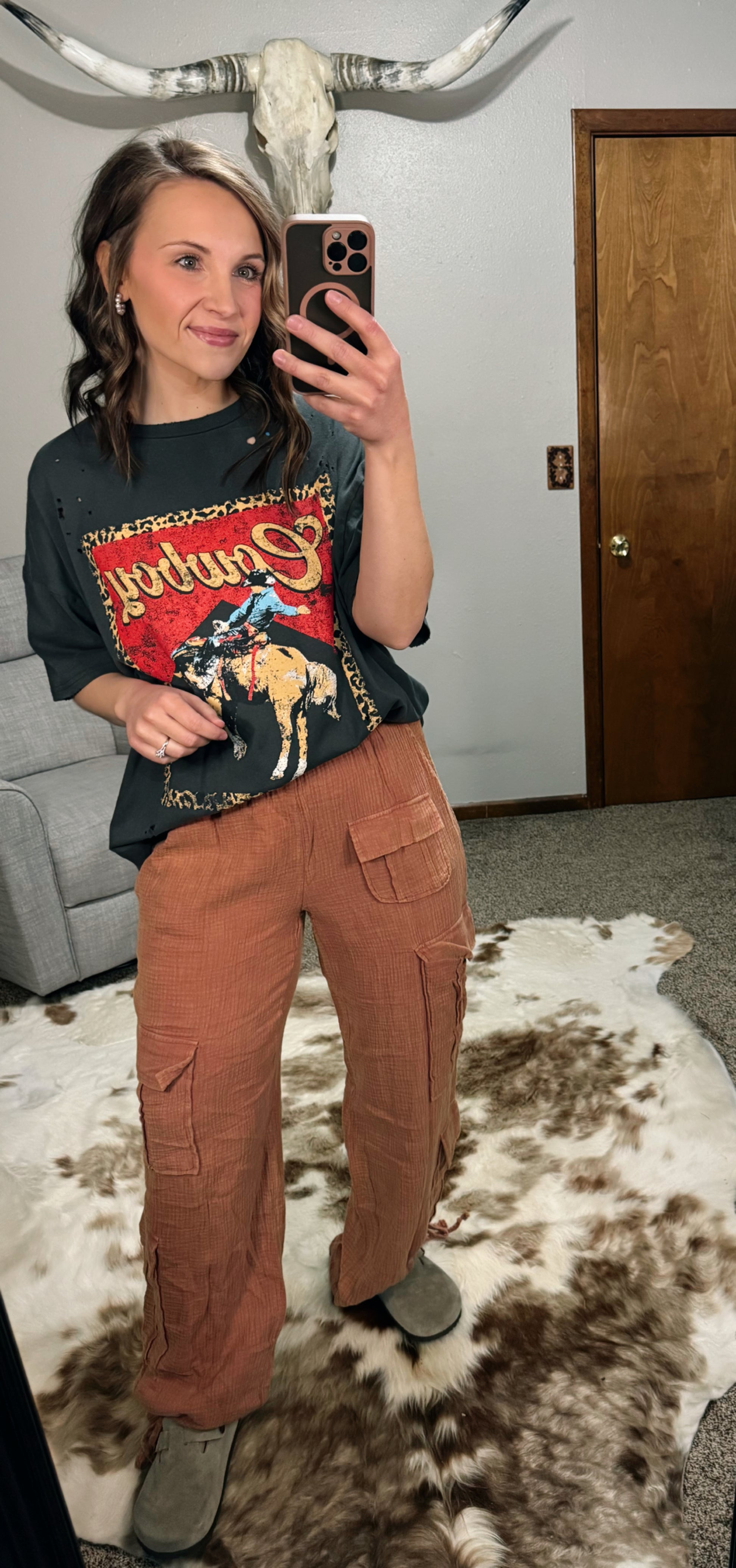 - Mineral washed cotton gauze cargo pants featuring a five cargo pocket style as well as two side hip pockets, an elastic waistband and a drawstring to cinch at the bottom.