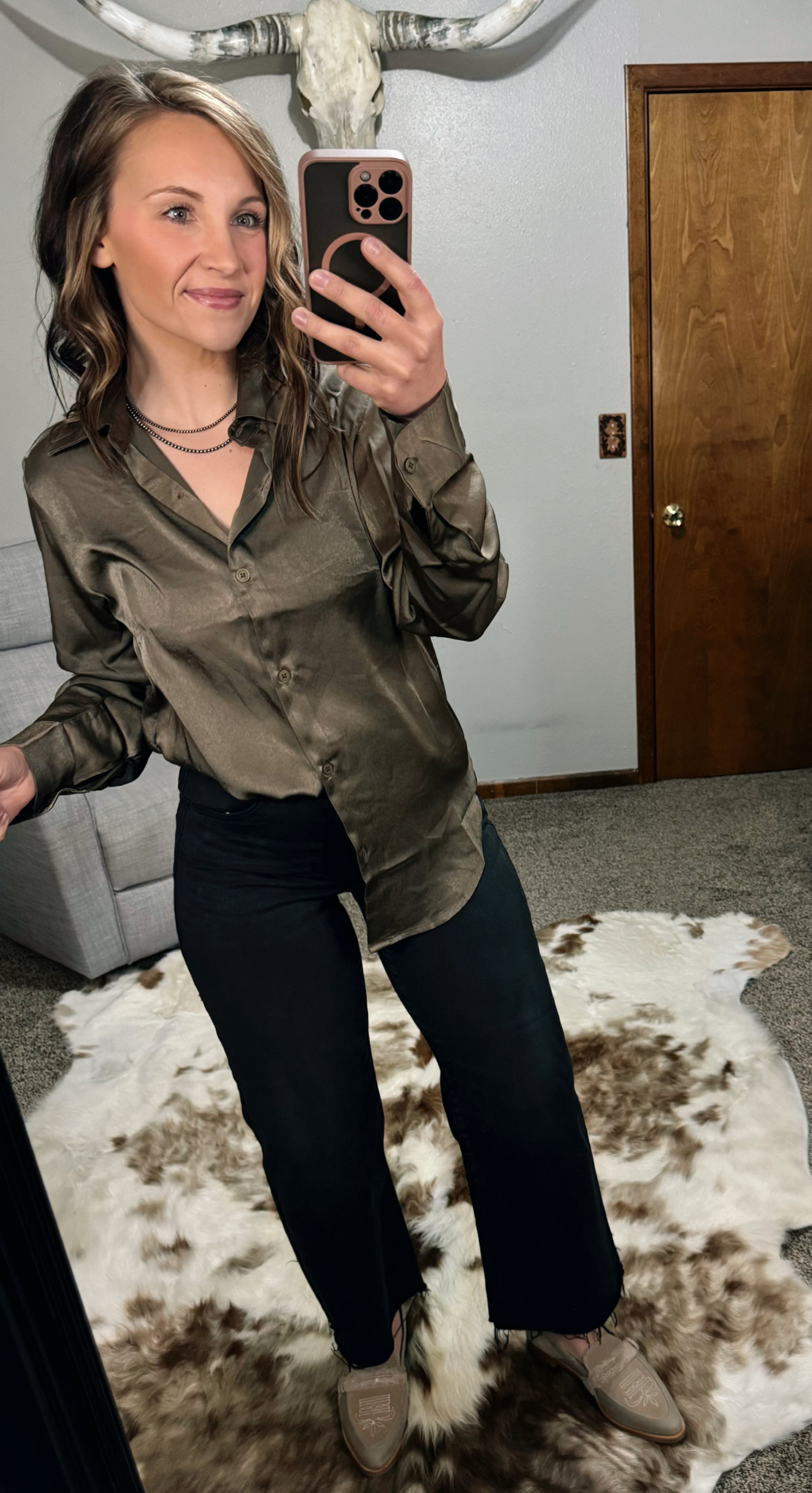 - This silky, solid color button down shirt has the perfect fit and length. Experiment with different styling options - button it all the way up for a classic look, leave a few buttons undone and tuck in one side for a more casual vibe, or simply wear it open. Pairs well with jeans and is perfect for elevating your outfit on any occasion.